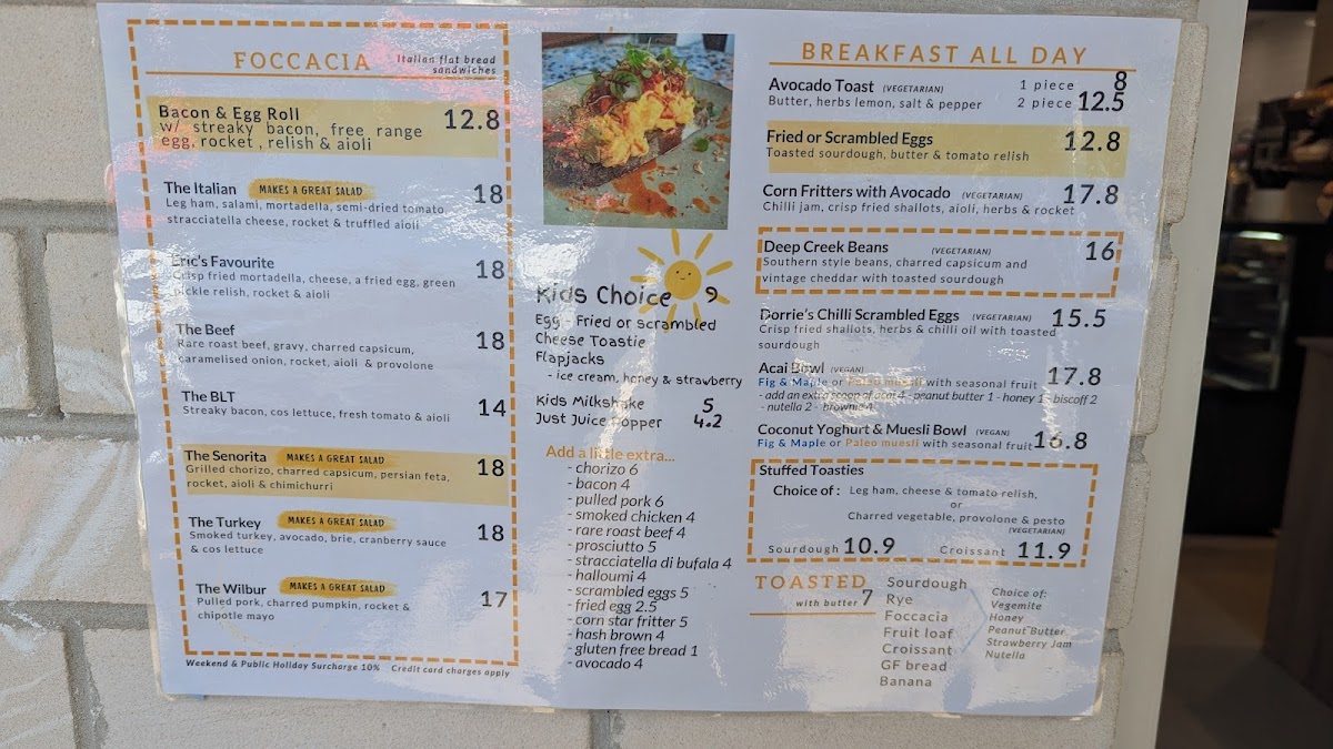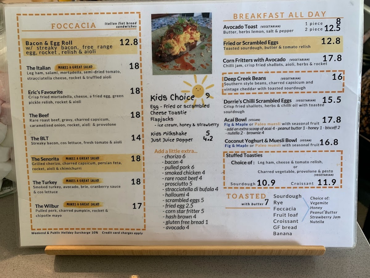 - Sandwiches and Rolls: This category includes a variety of filled options such as bacon & egg rolls, turkey sandwiches, Italian paninis, caprese, Waldorf, and salad rolls. These items are served on different types of bread including sourdough, rye, and schiacciata, offering diverse textures and flavors.